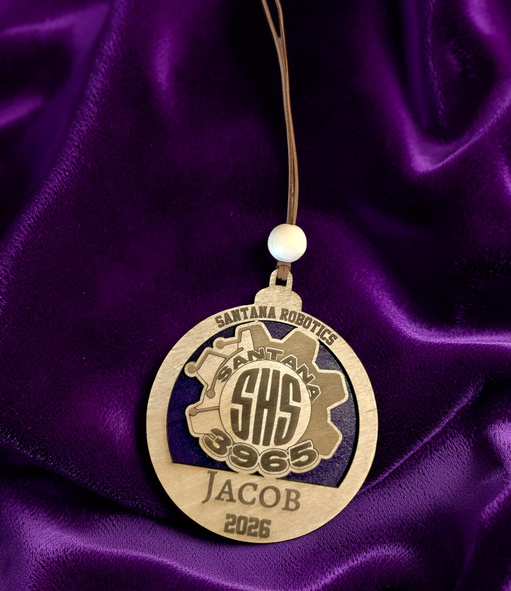 Designed in classic Santana purple and natural wood tones, this ornament features the Santana Robotics gear design, SHS detail, team number, personalized name, and graduation year. Perfect for attaching to senior night gift baskets, banquet tables, or saving as a memory ornament for years to come.